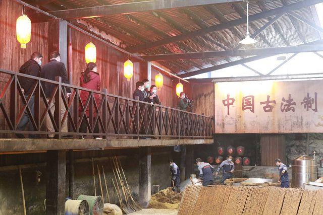 在雙龍戲珠酒業(yè)有限公司董事長(cháng)黃德鋒的陪同下,陳建新一行依次參觀(guān)走訪(fǎng)了雙龍戲珠酒廠(chǎng)品牌展示大廳、釀造車(chē)間以及貯酒山洞雙龍洞。